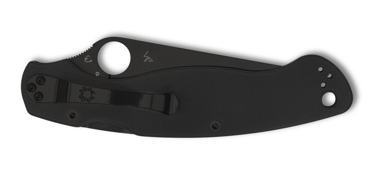 This Spyderco Knives Military 2 Lockback knife utilizes a 4 " Locking Straight-back blade with a full-flat grind, plain edge, 3.7mm thickness, thumb ramp and thumb hole. The blade material is CPM S30V Stainless Steel with Black DLC coating. The peel-ply-textured handle is Black G-10 with a Black 4-position pocket...