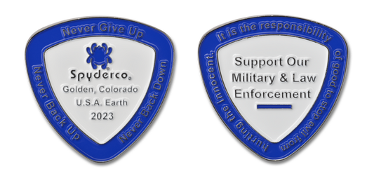 This reuleaux triangle Spydercoin was developed by Spyderco Knives. It is made from high-quality Nickel Silver and measures 1 1/2''L X 1 1/2''W X 1/8''H. This is Spyderco Coin shows the unwavering support of our nation's law enforcement and military personnel. It reminds us that "It is the responsibility of good to stop evil from hurting the innocent, and encourages us to Never give up, Never back up, and Never back down," and proudly bears the Spyderco logo and the year 2021.