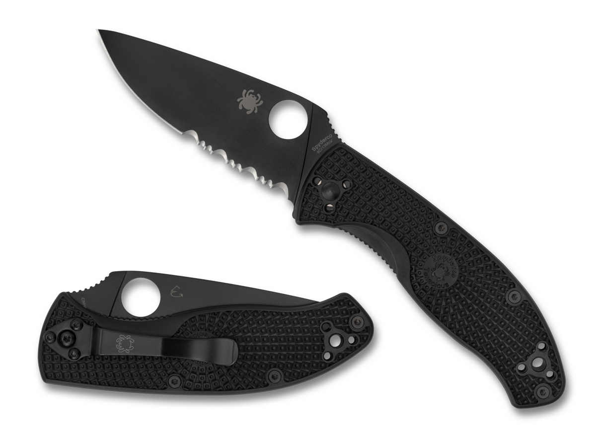 This Spyderco Knives Tenacious Liner Lock knife utilizes a 3 3/8" Locking Drop Point blade with a partially serrated edge, 3.1mm thickness and thumb hole. The blade material is 8Cr13MoV Stainless Steel with Black Oxide coating. The textured handle is Black FRN with a 4-position pocket clip and lanyard hole. It's around 4 3/8 inches long (folded/closed) and weighs approximately 3.7 ounces....