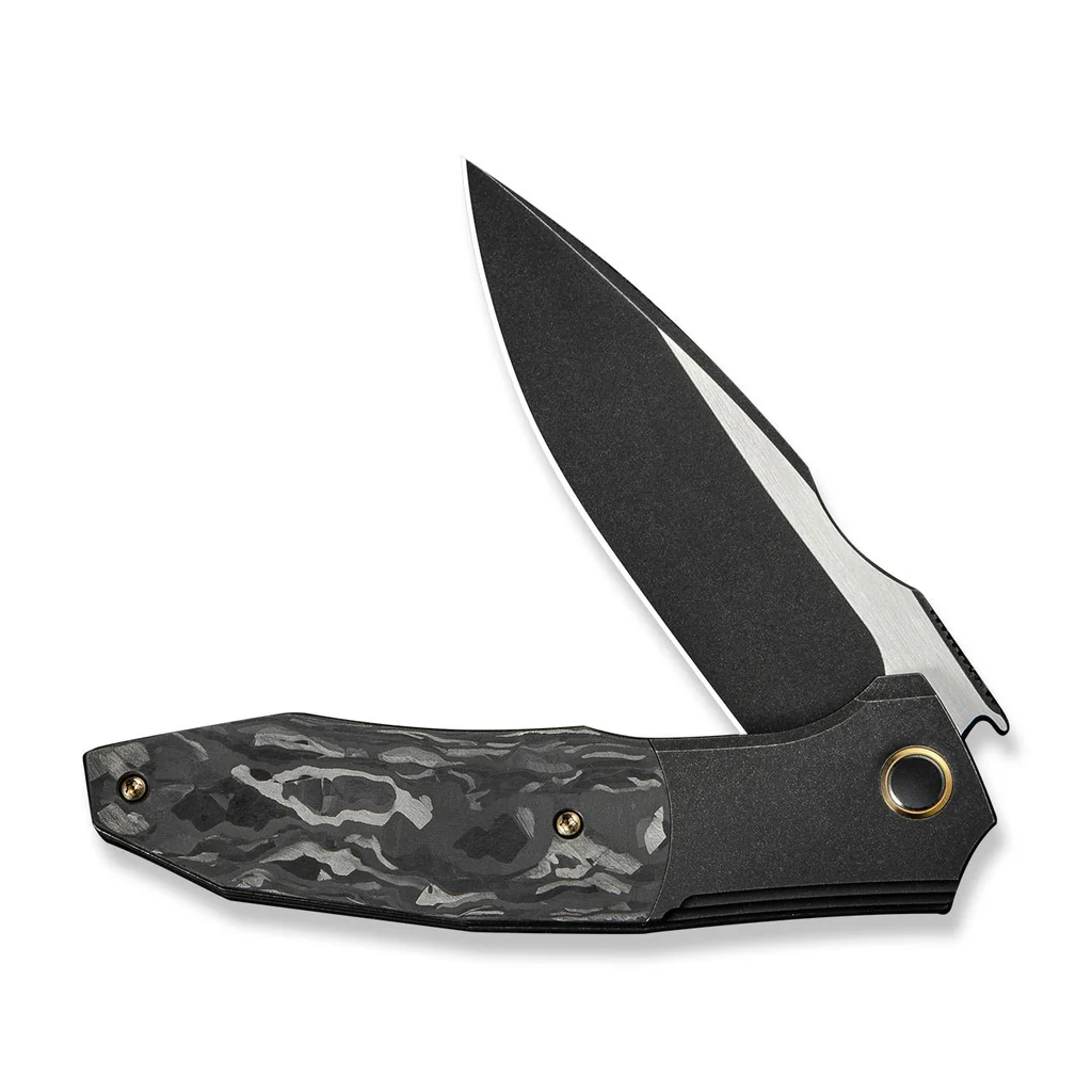 This WE Knife Co., Ltd Archeozoic Interframe Lock knife utilizes a 4" Locking Drop Point blade with a flat grind, 4mm (016.") thickness, swedge, thumb groove, spine jimping and finger lever. The blade material is M390 Stainless Steel (59-61HRC) with a Black Stonewashed finish and Satin flats. The handle is Shredded Carbon Fiber and Black 6AL4V Titanium with a right-carry tip-up Titanium pocket clip. It's around 5 inches long (folded/closed) and weighs approximately 4.5 ounces. Handcrafted in China, this knife comes complete with Limited Lifetime Manufacturer's Warranty, Storage Pouch and Box.