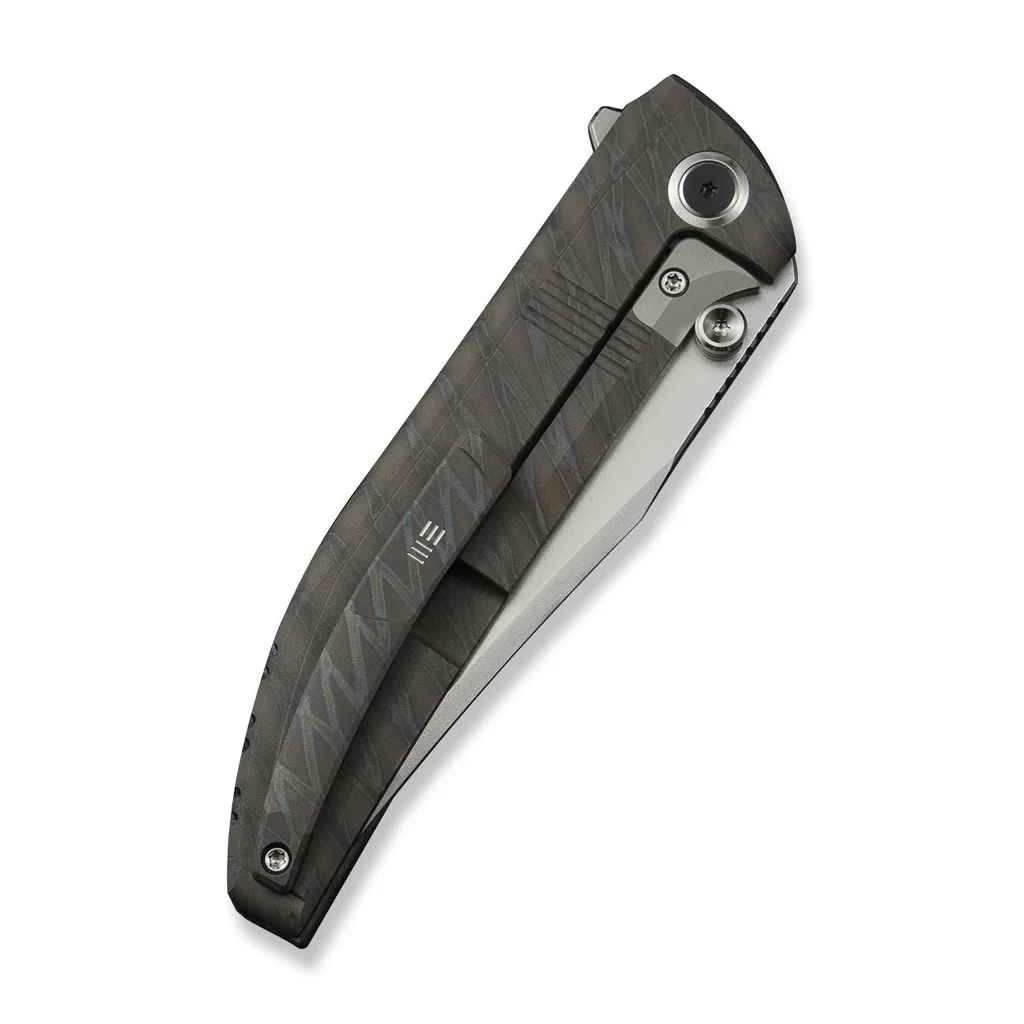 This WE Knife Co., Ltd Ezinta Frame Lock knife utilizes a 4" Locking Clip Point blade with a flat grind, 4mm (0.16") thickness, thumb studs and finger lever. The blade material is M390 Stainless Steel (58-60HRC) with a Polished Bead-blasted finish. The integal handle is Tiger Stripe Blue Flamed 6AL4V Titanium with Titanium hardware and right-carry tip-up Titanium pocket clip. It's around 5 inches long (folded/closed) and weighs approximately 5.9 ounces. Handcrafted in China, this knife comes complete with Limited Lifetime Manufacturer's Warranty, Storage Pouch and Box.