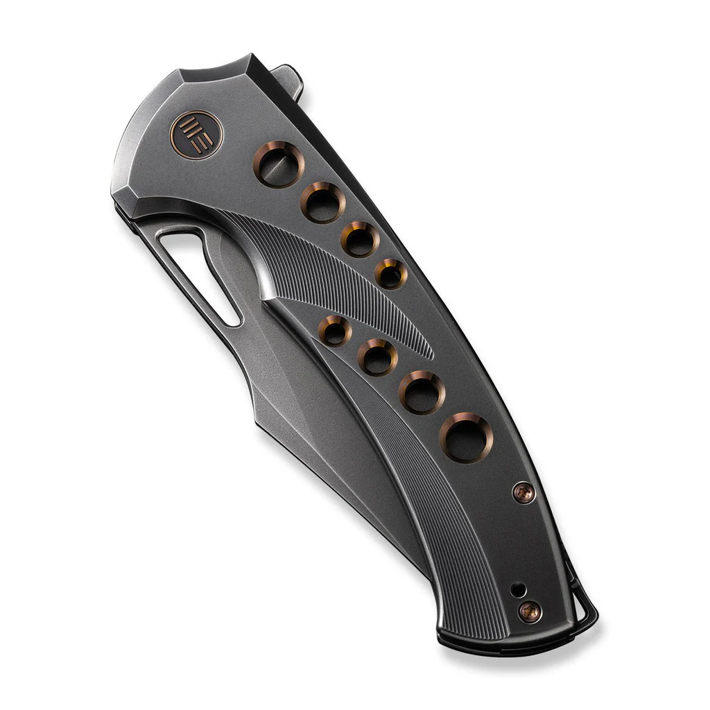This WE Knife Co., Ltd Swiftfin Frame Lock knife utilizes a 3 7/8" Locking Clip Point blade with a flat grind, 3.2mm (0.13") thickness, thumb hole and finger lever. The blade material is CPM 20CV Stainless Steel (58-60HRC) with a Polished Gray finish. The milled handle is Dark Gray 6AL4V Titanium with a reversible tip-up Titanium pocket clip, Damasteel pivot cap, and lanyard hoop. It's around 5 1/4 inches long (folded/closed) and weighs approximately 5.5 ounces. Handcrafted in China, this knife comes complete with Limited Lifetime Manufacturer's Warranty, Storage Pouch and Box.