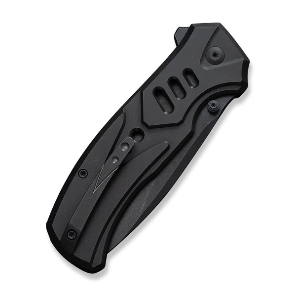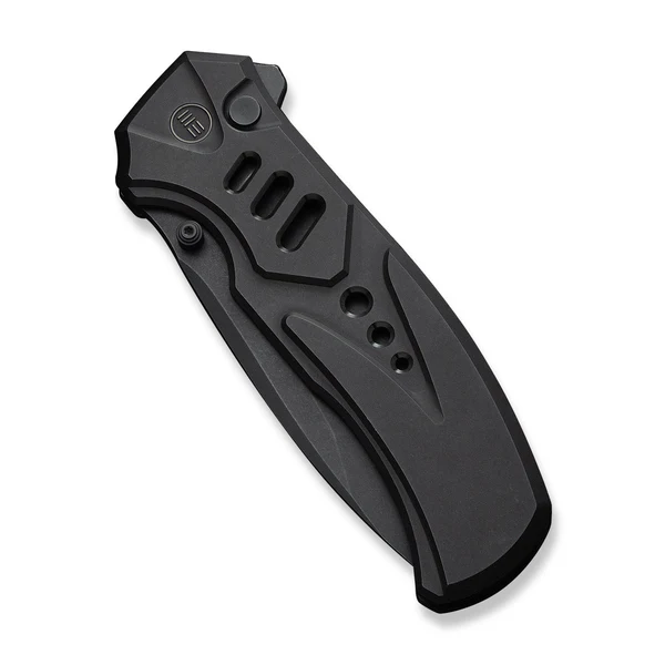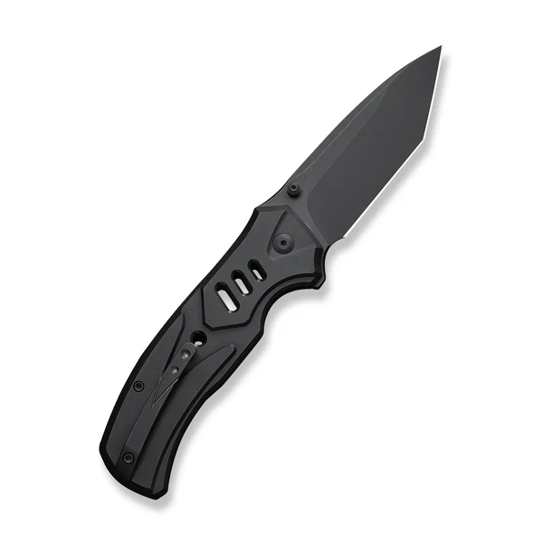 This WE Knife Co., Ltd Zentron Button Lock knife utilizes a 3 1/2" Locking Drop Point Tanto blade with a flat grind, 3.2mm (0.13") thickness, swedge, thumb studs, finger lever and finger choil. The blade material is M390 Stainless Steel (58-60HRC) with a Black Stonewashed finish. The handle is Black Anodized 6AL4V Titanium with a right-carry tip-up Titanium pocket clip, lanyard hole, and 'blade window' milling. It's around 4 5/8 inches long (folded/closed) and weighs approximately 4.6 ounces. Handcrafted in China, this knife comes complete with Limited Lifetime Manufacturer's Warranty, Storage Pouch and Box.