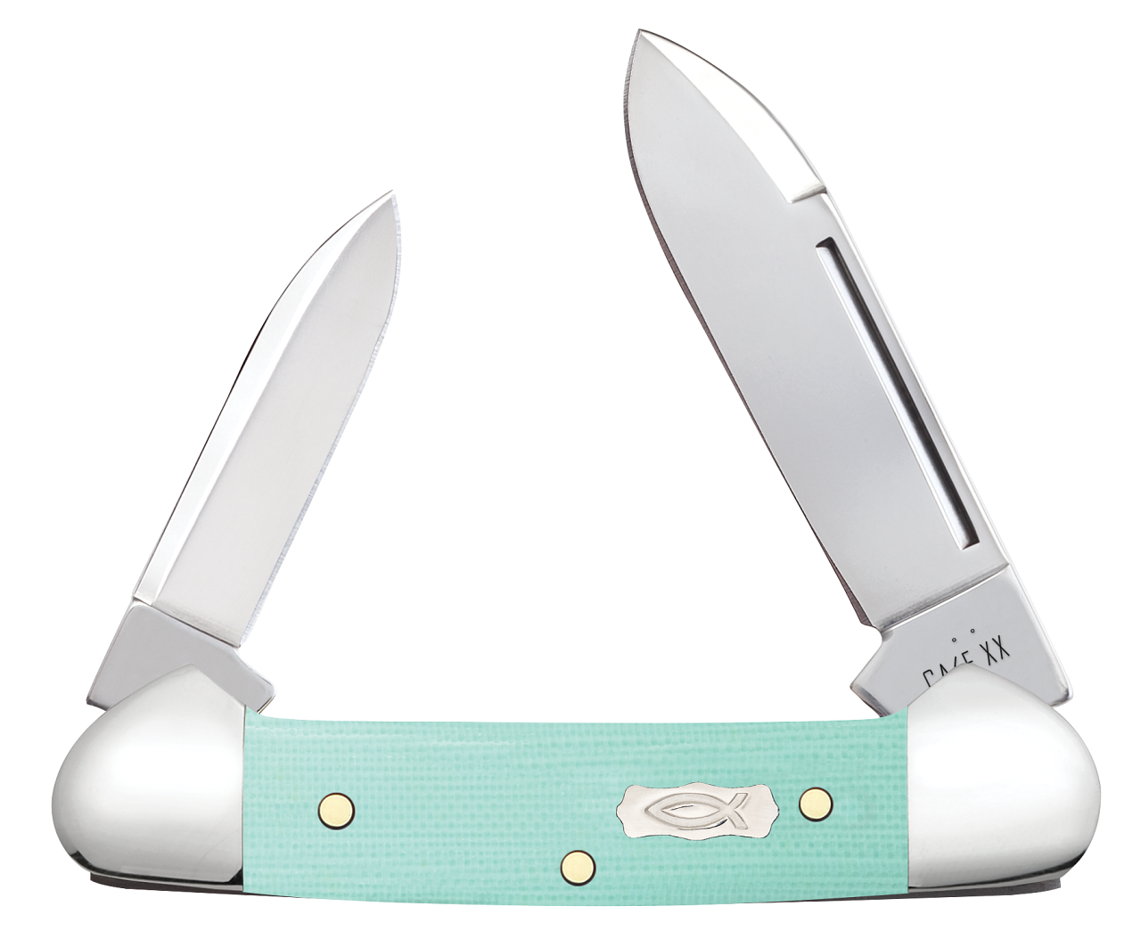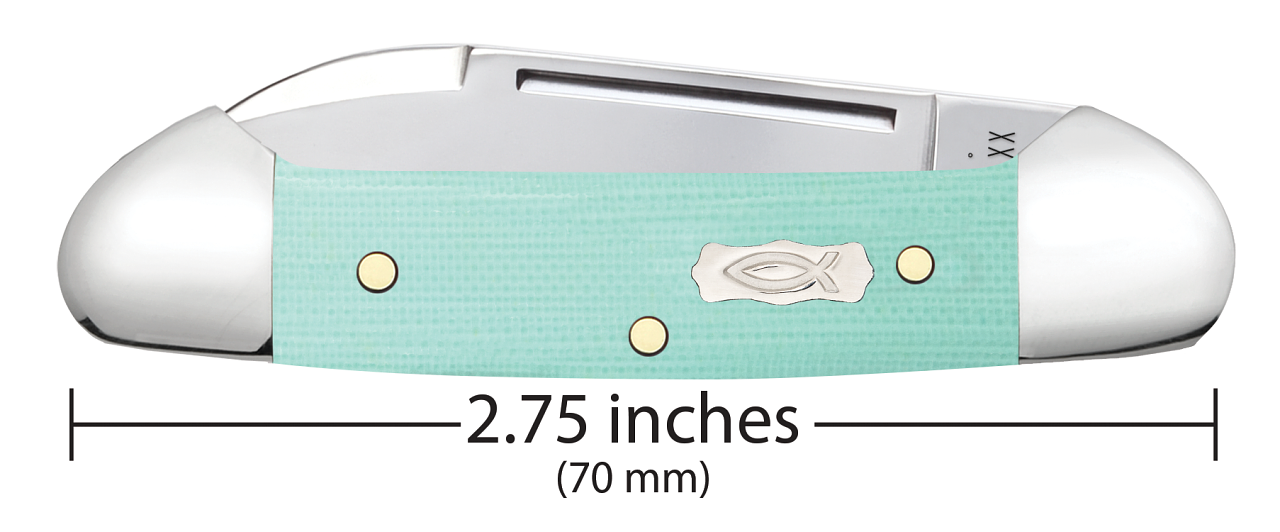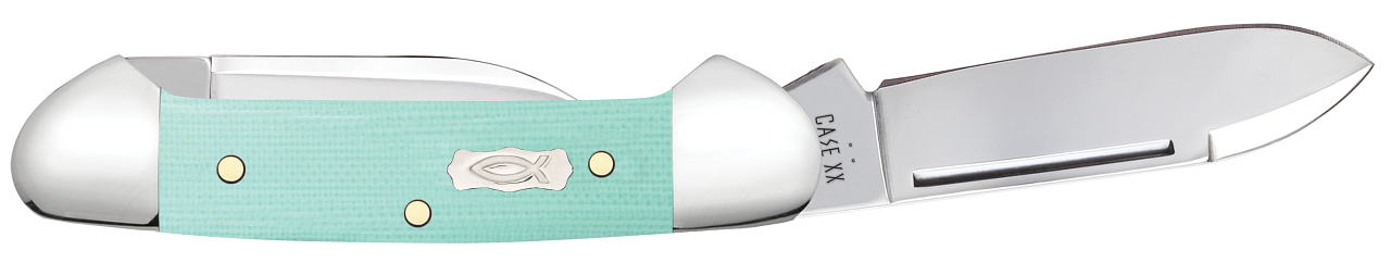 This W.R. Case & Sons Cutlery Co. Butterbean knife utilizes a 2" Spear point blade and 1 1/2" Pen blade. Stamped with pattern number 102132 SS, the blade material is Tru-Sharp Surgical Stainless Steel with a mirror-polished finish. The handle is smooth Seafoam Green G-10 with a Nickel Silver Lobed Ichthus Inlay shield. The bolsters are Highly polished Nickel Silver. It's around 2 3/4 inches long (folded/closed) and weighs approximately 1.4 ounces.