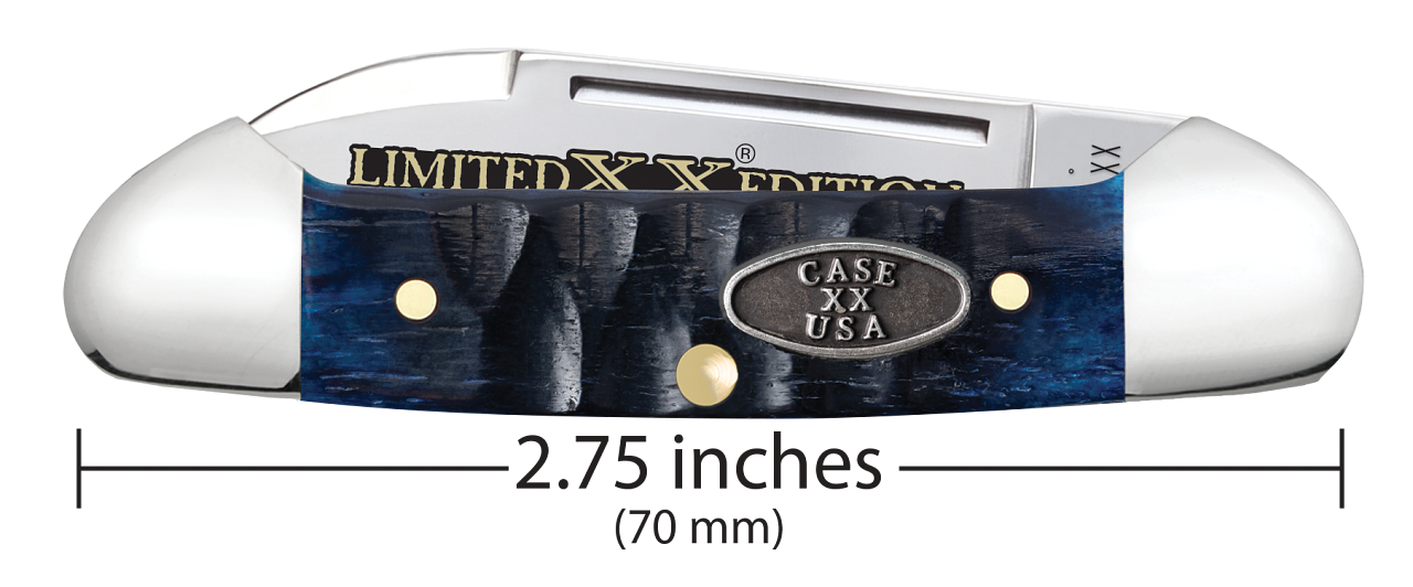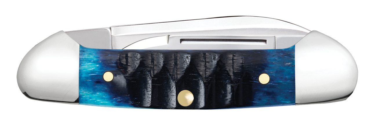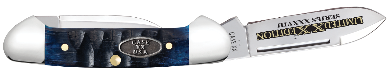 This W.R. Case & Sons Cutlery Co. Butterbean knife utilizes a 2" Spear point blade and 1 1/2" Pen blade. Stamped with pattern number 62132 SS, the blade material is Tru-Sharp Surgical Stainless Steel with a mirror-polished finish and etched with 'Limited XX Edition Series XXXVIII'. The handle is Gator jigged Ocean Blue Bone with a Oval Pewter Case XX USA Inlay shield. The bolsters are Highly polished Nickel Silver. It's around 2 3/4 inches long (folded/closed) and weighs approximately 1.4 ounces.... Read Less