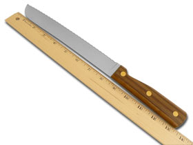 This W.R. Case & Sons Cutlery Co. Kitchen Bread Knife knife utilizes a 8 " Bread blade. Stamped with pattern number XX623, the blade is Miracl-edge Stainless Steel with Case XX 623 Stainless and Made in U.S.A. etching. The handle is Walnut Wood with Case XX etching. It's around 13 1/2 inches long (total) and weighs approximately 6.0 ounces.