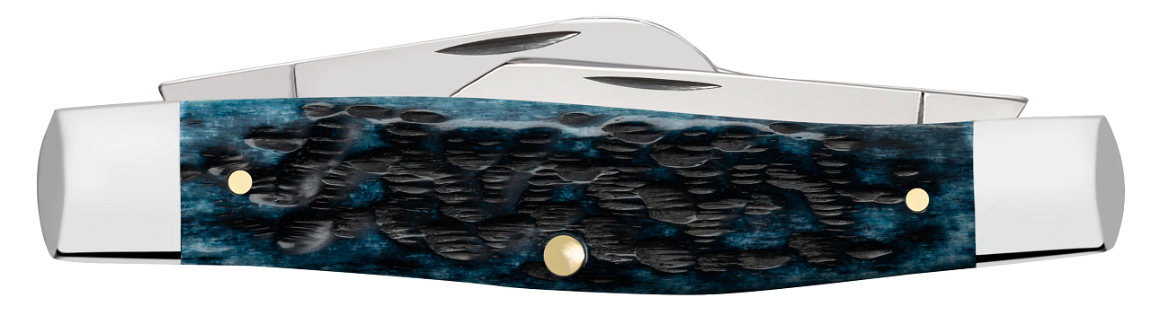 This W.R. Case & Sons Cutlery Co. Large Stockman knife utilizes a 3 1/4" Clip blade, 2 1/4" Sheepsfoot Coping blade, and a 2 1/4" Spey blade. Stamped with pattern number 6375 SS, the blade material is Tru-Sharp Stainless Steel with a Mirror-polished finish. The handle is Pocket Worn Mediterranean Blue Bone with a Case Lobed Nickel Silver Inlay shield. The bolsters are highly polished Nickel Silver. It's around 4 1/4 inches long (folded/closed) and weighs approximately 3.9 ounces.