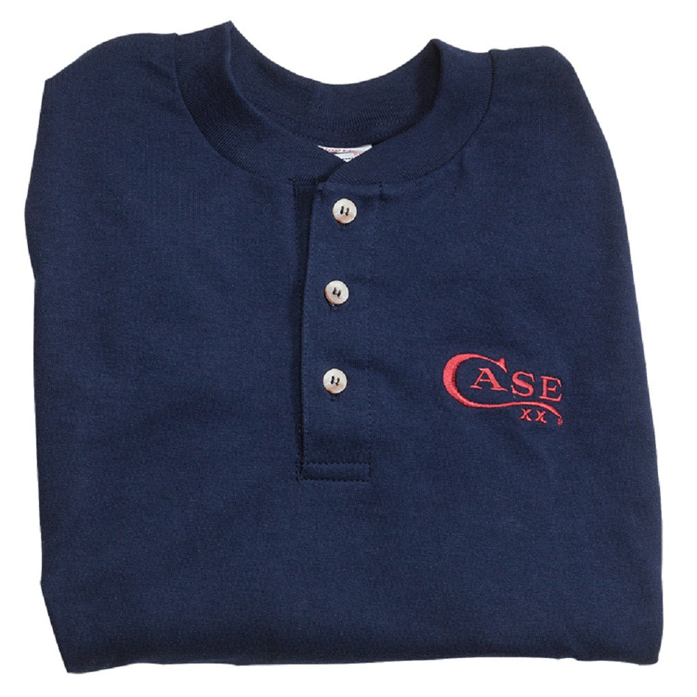 This navy blue henley Long Sleeve T-shirt was developed by W.R. Case & Sons Cutlery Co.. It is made from high-quality Cotton and measures a Medium. This Case XX Shirt features Knit Cuffs and Button Collar and is made in the U.S.A.