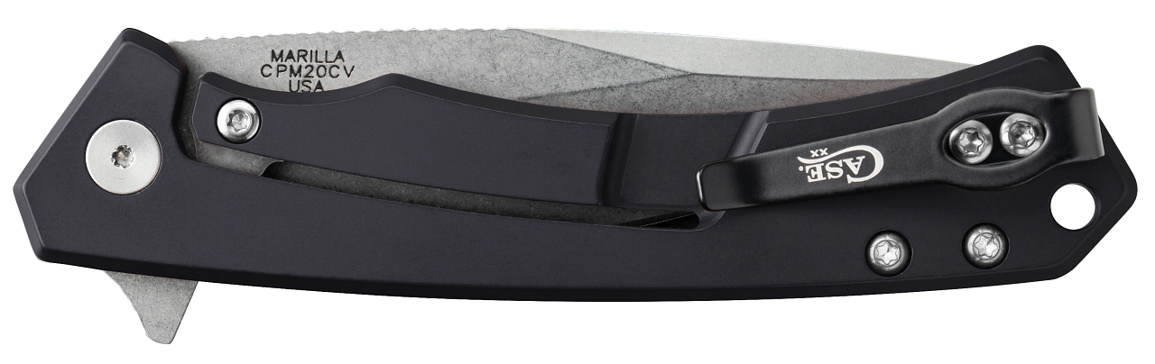 This W.R. Case & Sons Cutlery Co. Marilla Frame Lock knife utilizes a 3 1/2" Locking Drop Point blade with a plain edge, 4mm thickness and finger lever. Stamped with pattern number MARILLA CPM20CV, the blade material is CPM 20CV Stainless Steel with Stonewashed finish. The handle is Black Anodized Aluminum with textured G10 Inlays, a lanyard hole and reversible tip-up pocket clip. It's around 4 3/4 inches long (folded/closed) and weighs approximately 3.5 ounces.