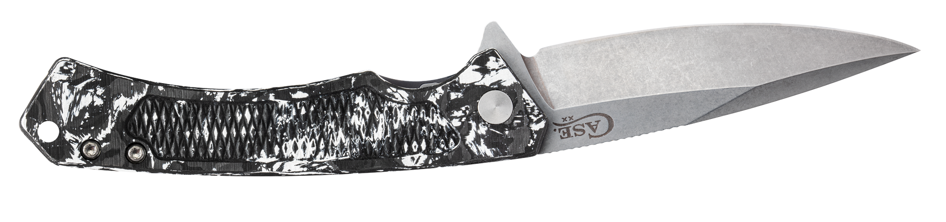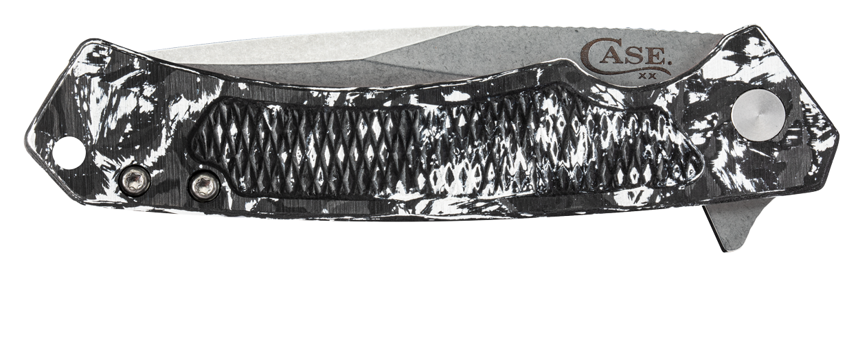 This W.R. Case & Sons Cutlery Co. Marilla Frame Lock knife utilizes a 3 3/8" Locking Drop Point blade with a plain edge, 4mm thickness, spine jimping and finger lever. Stamped with pattern number MARILLA S35VN, the blade material is S35VN Stainless Steel with Stonewashed finish. The handle is White & Black Marbled Carbon Fiber and Black anodized Aluminum with a right-carry tip-up pocket clip and lanyard hole. It's around 4 3/4 inches long (folded/closed) and weighs approximately 3.3 ounces....