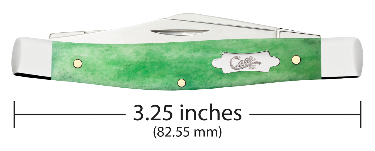 This W.R. Case & Sons Cutlery Co. Medium Stockman knife utilizes a 2 1/2" Clip blade, 1 5/8" Sheepfoot Coping blade and 1 5/8" Pen blade. Stamped with pattern number 6344 SS, the blade material is Tru-Sharp Stainless Steel with a Mirror-polished finish. The handle is Smooth Emerald Green Bone with a Bowtie Nickel Silver Case Inlay shield. The bolsters are highly polished Nickel Silver. It's around 3 1/4 inches long (folded/closed) and weighs approximately 1.9 ounces.