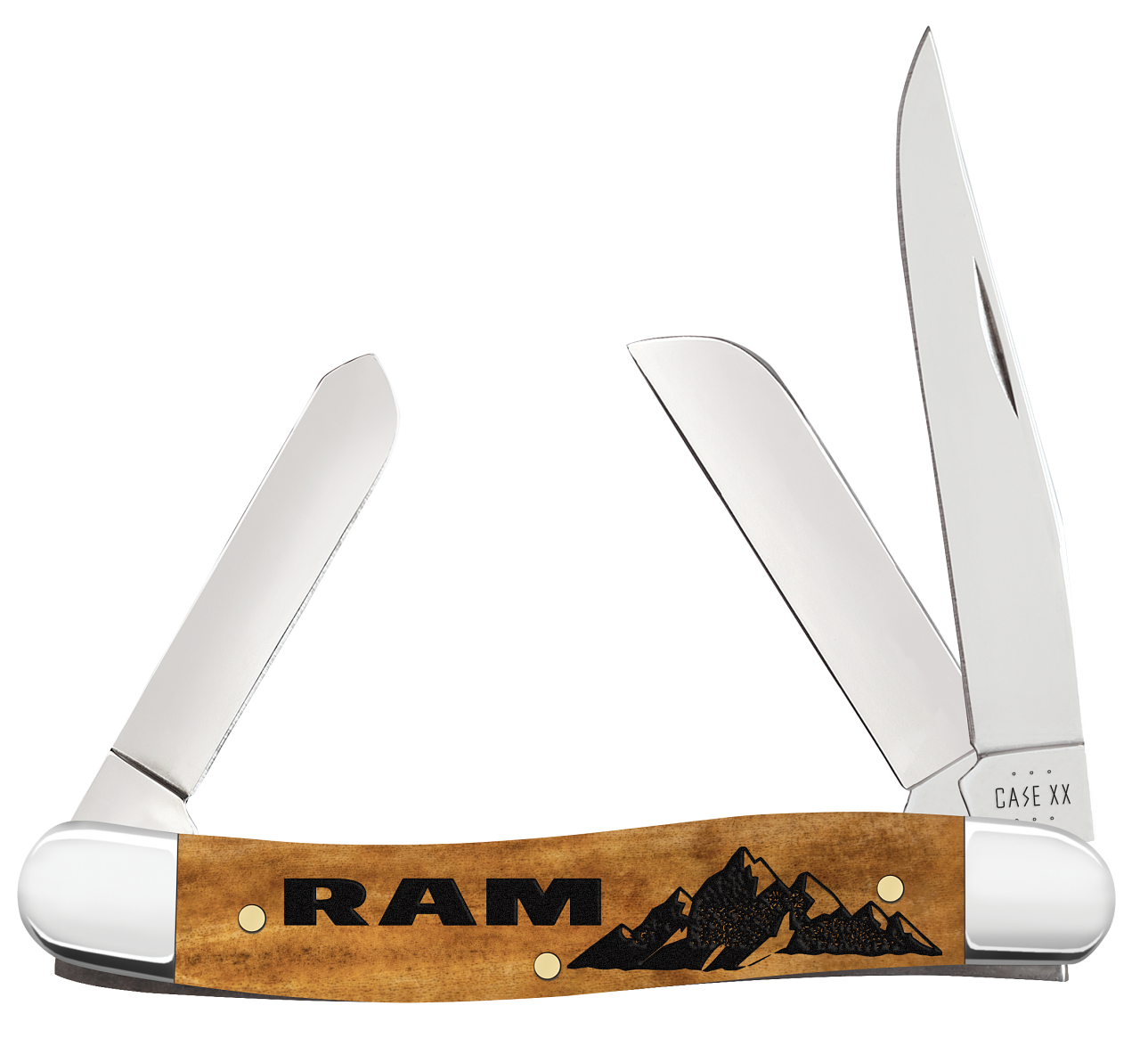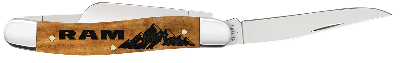 This W.R. Case & Sons Cutlery Co. Medium Stockman knife utilizes a 2 1/2" Clip blade, 1 7/8" Sheepsfoot Coping blade, and a 1 3/4" Spey blade. Stamped with pattern number 6318 SS, the blade material is Tru-Sharp Stainless Steel with a Mirror-polished finish. The handle is smooth Antique Bone with "RAM" and mountain scene etched on the front side. The bolsters are highly polished Nickel Silver. It's around 3 5/8 inches long (folded/closed) and weighs approximately 2.1 ounces.