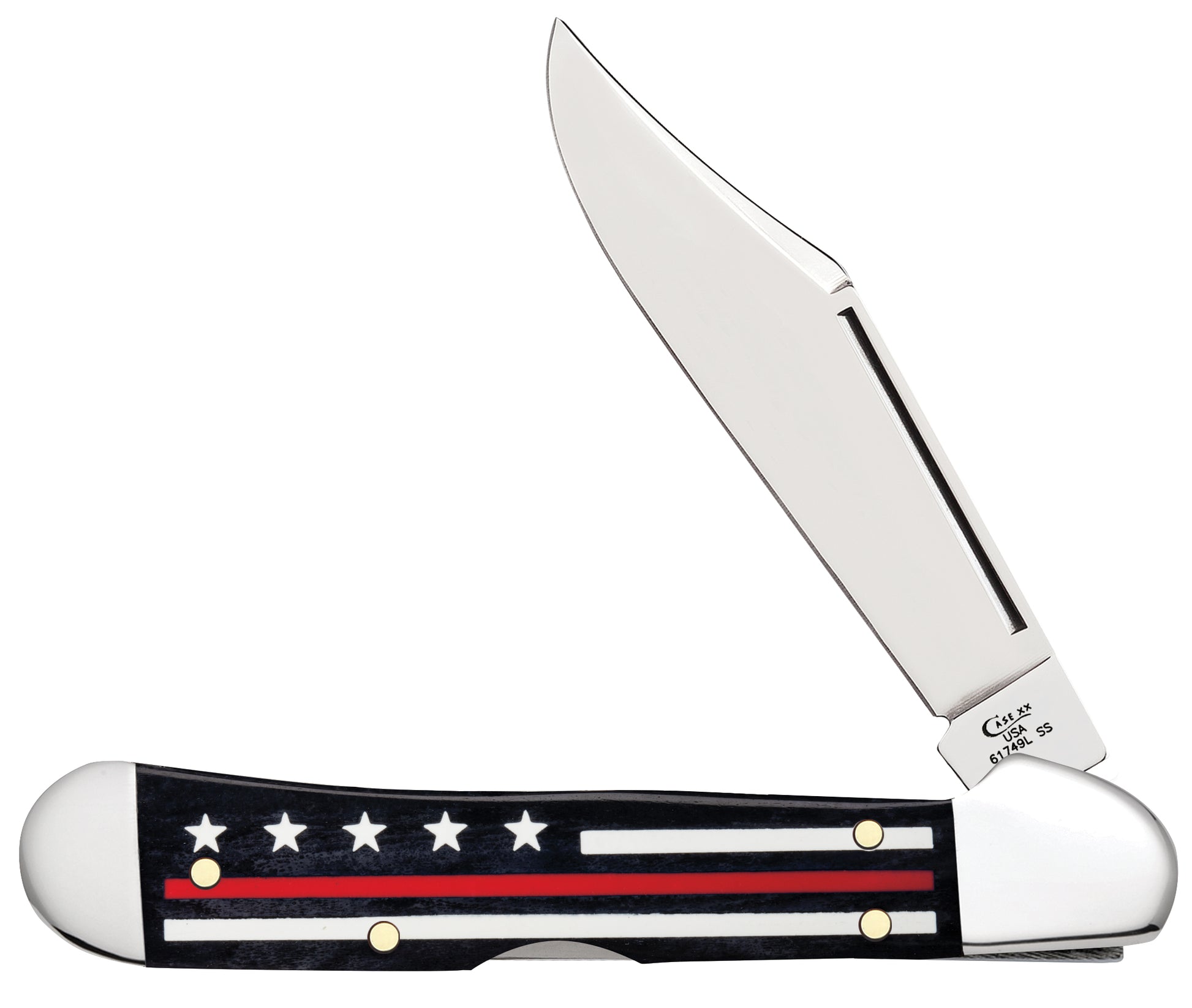 This W.R. Case & Sons Cutlery Co. Mini Copperlock knife utilizes a 2 3/4" Locking Clip blade. Stamped with pattern number 61749L SS, the blade material is Tru-Sharp Surgical Stainless Steel. The handle is Color Wash Natural Bone with Thin Red Line Stripes of Service Flag on both sides. The bolsters are highly polished Nickel Silver. It's around 3 5/8 inches long (folded/closed) and weighs approximately 1.9 ounces.