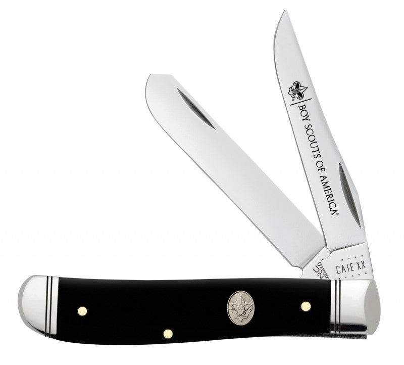This W.R. Case & Sons Cutlery Co. Mini Trapper knife utilizes a 2 3/4" Clip blade and 2 3/4" Spey blade. Stamped with pattern number 2207 SS, the blade material is Tru-Sharp Surgical Stainless Steel. The handle is Black Synthetic with an Oval Cast Boy Scouts of America Inlay shield. The bolsters are Scored Nickel Silver. It's around 3 1/2 inches long (folded/closed) and weighs approximately 2.5 ounces.