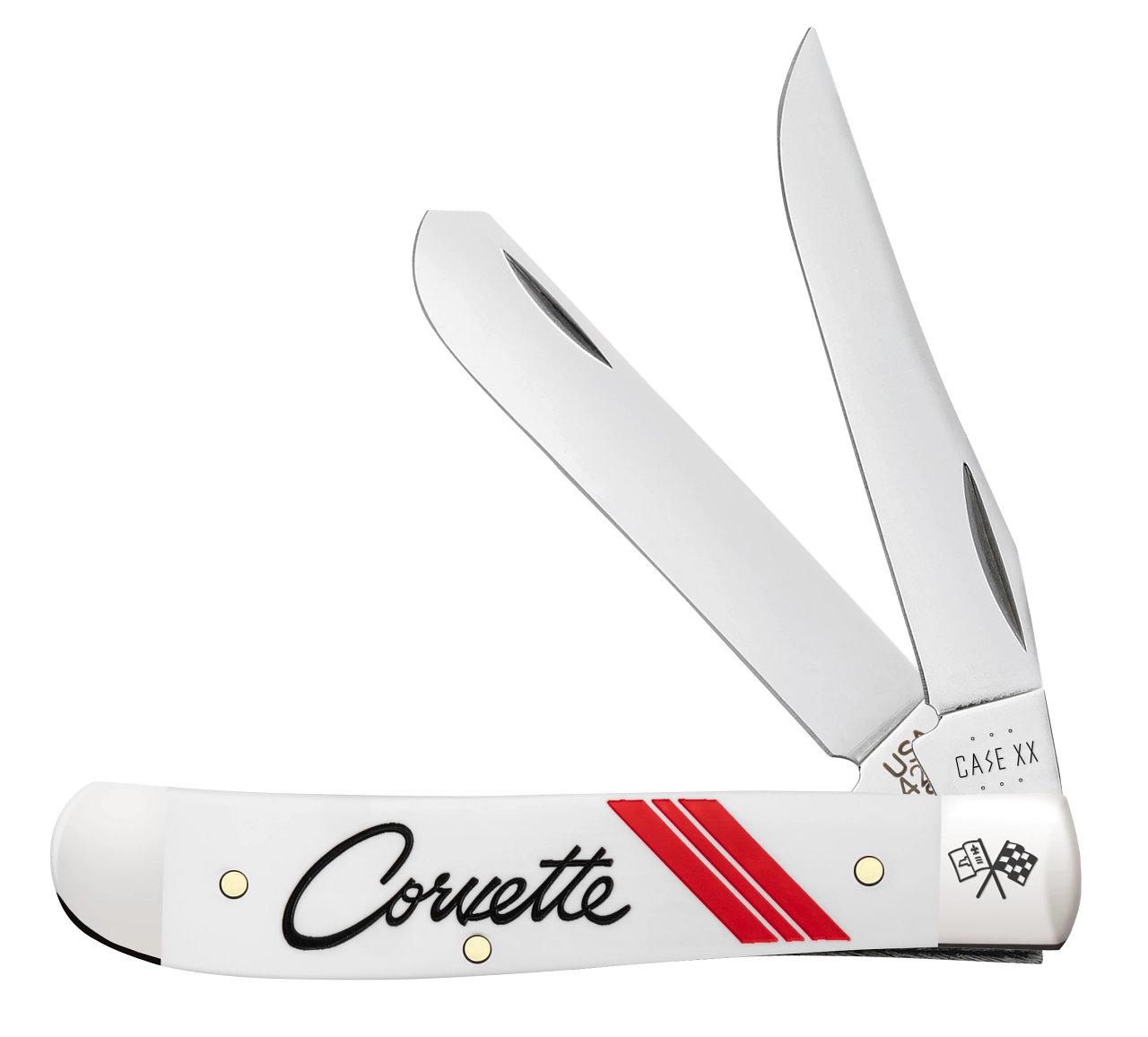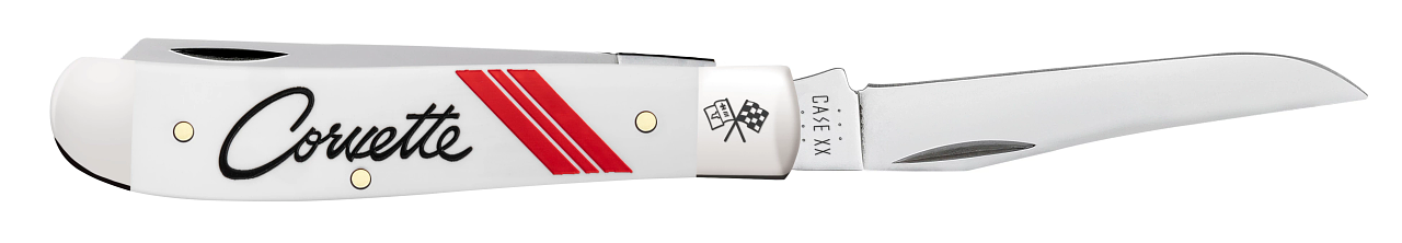 This W.R. Case & Sons Cutlery Co. Mini Trapper knife utilizes a 2 3/4" Clip blade and 2 3/4" Spey blade. Stamped with pattern number 4207 SS, the blade material is Tru-Sharp Surgical Stainless Steel with a mirror-polished finish. The handle is White Synthetic engraved with red stripes and 'Corvette'. The highly polished Nickel Silver bolsters are engraved with the Corvette insignia. It's around 3 1/2 inches long (folded/closed) and weighs approximately 2.5 ounces.