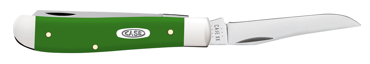 This W.R. Case & Sons Cutlery Co. Mini Trapper knife utilizes a 2 3/4" Clip blade and 2 3/4" Spey blade. Stamped with pattern number 4207 SS, the blade material is Tru-Sharp Surgical Stainless Steel with Mirror-polished finish. The handle is Green Synthetic with an Oval Nickel Silver CASE Inlay shield. The bolsters are highly polished Nickel Silver. It's around 3 1/2 inches long (folded/closed) and weighs approximately 2.7 ounces.