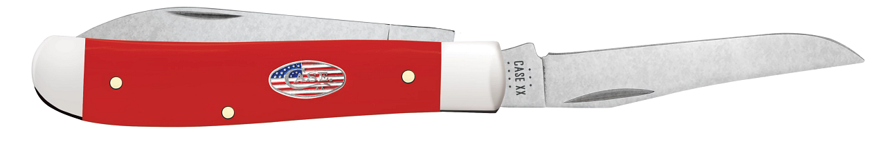 This W.R. Case & Sons Cutlery Co. Mini Trapper knife utilizes a 2 3/4" Clip blade and 2 3/4" Wharncliffe blade. Stamped with pattern number 4207W CS, the blade material is Carbon Steel with a Satin finish.Note: Carbon Steel is generally harder than stainless steel, this allows the blade to hold a sharper edge, longer. However, Carbon Steel will corrode/rust if it's not cleaned and oiled regularly. The handle is Red Synthetic with an Oval Nickel Silver Stars & Stripes Inlay shield. The bolsters are highly polished Nickel Silver. It's around 3 1/2 inches long (folded/closed) and weighs approximately 2.7 ounces....