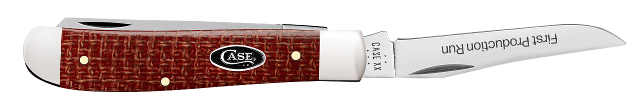 One of only 250 made! This W.R. Case & Sons Cutlery Co. Mini Trapper knife utilizes a 2 3/4" Clip blade and 2 3/4" Spey blade. Stamped with pattern number 10207 CS, the blade material is 1095 Carbon Steel with a mirror-polished finish and etched with 'First Production Run'.Note: Carbon Steel is generally harder than stainless steel, this allows the blade to hold a sharper edge, longer. However, Carbon Steel will corrode/rust if it's not cleaned and oiled regularly. The handle is smooth Dark Red Burlap Micarta with a Black Oval Script Inlay shield. The bolsters are Highly polished Nickel Silver. It's around 3 1/2 inches long (folded/closed) and weighs approximately 2.5 ounces.