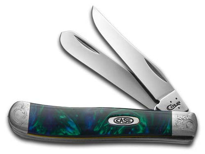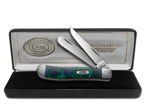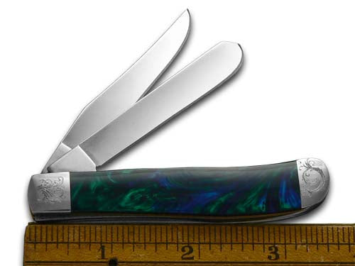 This W.R. Case & Sons Cutlery Co. Mini Trapper knife utilizes a 2 3/4" Clip blade and 2 3/4" Spey blade. Stamped with pattern number 9207 SS, the blades are highly polished Tru-Sharp Surgical Stainless Steel. The handle is Custom Genuine Aquarius Corelon with a Nickel Silver Case Oval Inlay Shield. The Scrolled bolsters are Nickel Silver. It's around 3 1/2 inches long (folded/closed) and weighs approximately 2.5 ounces. This knife is presented in a Black Collector's Box with a Certificate of Authenticity.