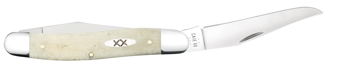 This W.R. Case & Sons Cutlery Co. Muskrat knife utilizes two 3" Clip point blades. Stamped with pattern number MUSKRAT SS, the blade material is Tru-Sharp Surgical Stainless Steel with a mirror-polished finish. The handle is smooth Natural Bone with a Nickel Silver Oval XX Inlay shield. The bolsters are Highly polished Nickel Silver. It's around 3 7/8 inches long (folded/closed) and weighs approximately 2.5 ounces.