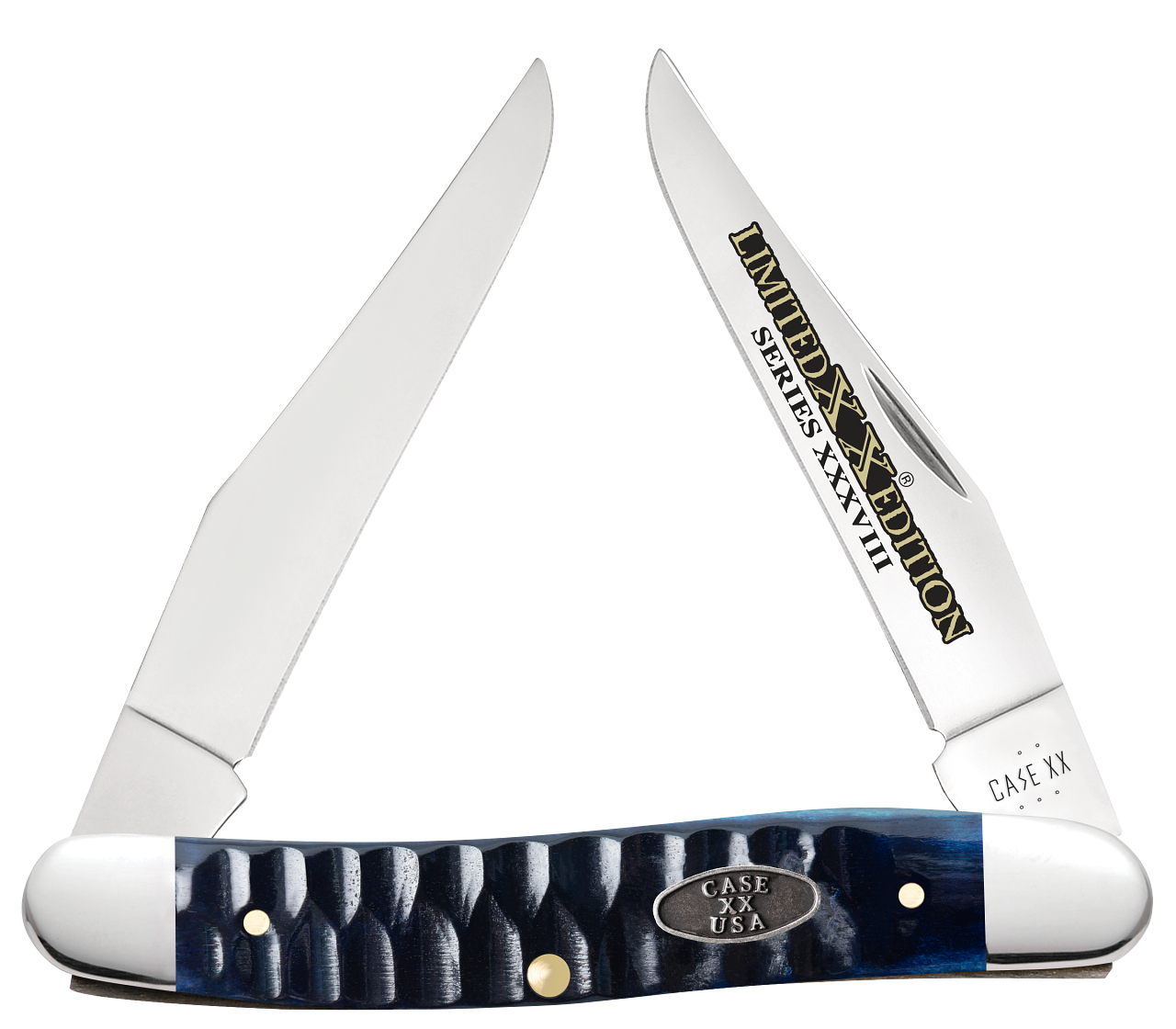 This W.R. Case & Sons Cutlery Co. Muskrat knife utilizes two 3" Clip point blades. Stamped with pattern number MUSKRAT SS, the blade material is Tru-Sharp Surgical Stainless Steel with a mirror-polished finish and etched with 'Limited XX Edition Series XXXVIII'. The handle is Gator jigged Ocean Blue Bone with a Oval Pewter Case XX USA Inlay shield. The bolsters are Highly polished Nickel Silver. It's around 3 7/8 inches long (folded/closed) and weighs approximately 2.5 ounces.... Read Less