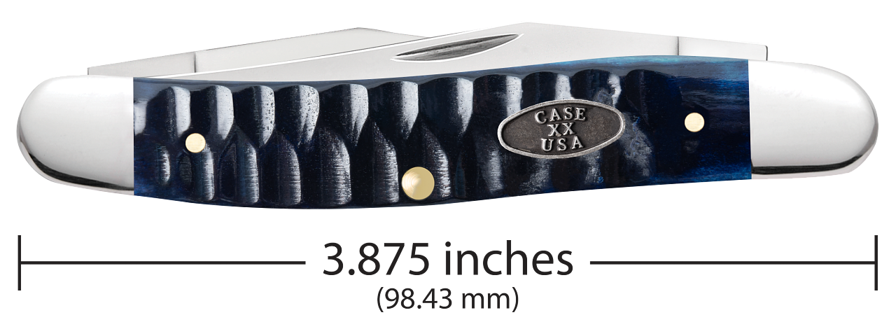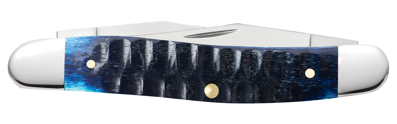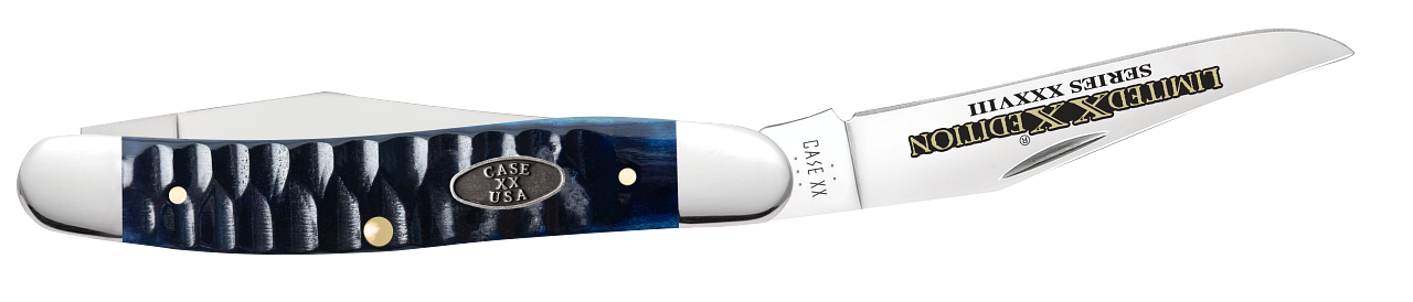 This W.R. Case & Sons Cutlery Co. Muskrat knife utilizes two 3" Clip point blades. Stamped with pattern number MUSKRAT SS, the blade material is Tru-Sharp Surgical Stainless Steel with a mirror-polished finish and etched with 'Limited XX Edition Series XXXVIII'. The handle is Gator jigged Ocean Blue Bone with a Oval Pewter Case XX USA Inlay shield. The bolsters are Highly polished Nickel Silver. It's around 3 7/8 inches long (folded/closed) and weighs approximately 2.5 ounces.
