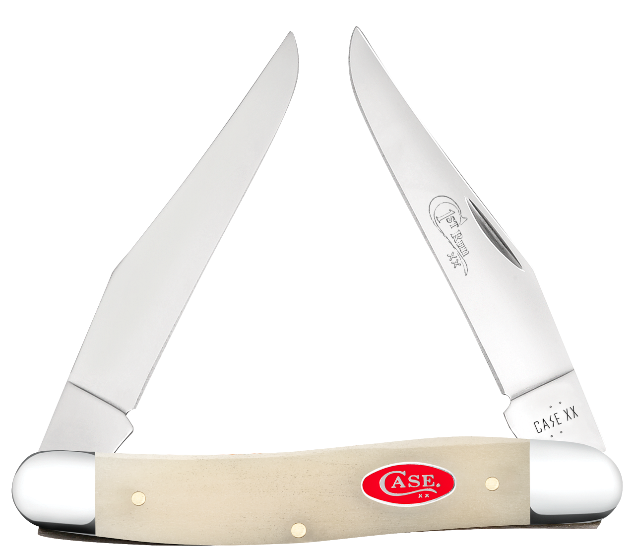 One of only 250 made! This W.R. Case & Sons Cutlery Co. Muskrat knife utilizes two 3" Clip point blades. Stamped with pattern number MUSKRAT SS, the blade material is Tru-Sharp Surgical Stainless Steel with a mirror-polished finish and engraved with Case XX '1st Run' logo. The handle is smooth Natural Bone with a Red Oval Script Inlay shield. The bolsters are Highly polished Nickel Silver. It's around 3 7/8 inches long (folded/closed) and weighs approximately 2.5 ounces. The knife is presented with a Case XX 'First Production Run' Box.