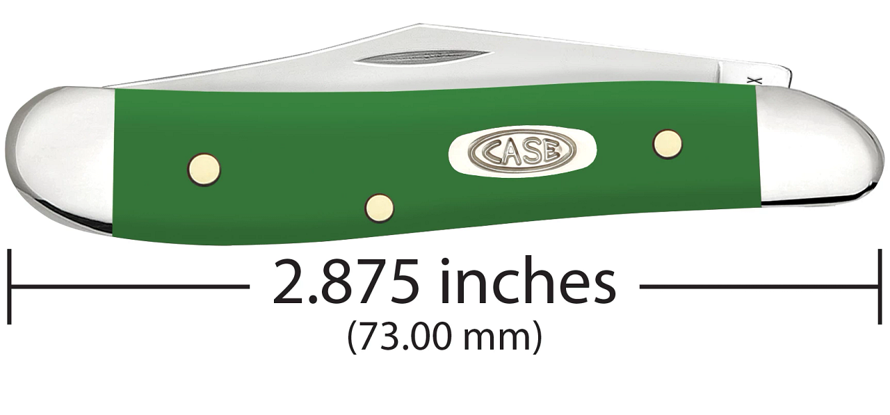 This W.R. Case & Sons Cutlery Co. Peanut knife utilizes a 2 1/8" Clip blade and 1 1/2" Pen blade. Stamped with pattern number 4220 SS, the blade material is Tru-Sharp Surgical Stainless Steel with Mirror-polished finish. The handle is Green Synthetic with an Oval Nickel Silver CASE Inlay shield. The bolsters are highly polished Nickel Silver. It's around 2 3/4 inches long (folded/closed) and weighs approximately 1.2 ounces.