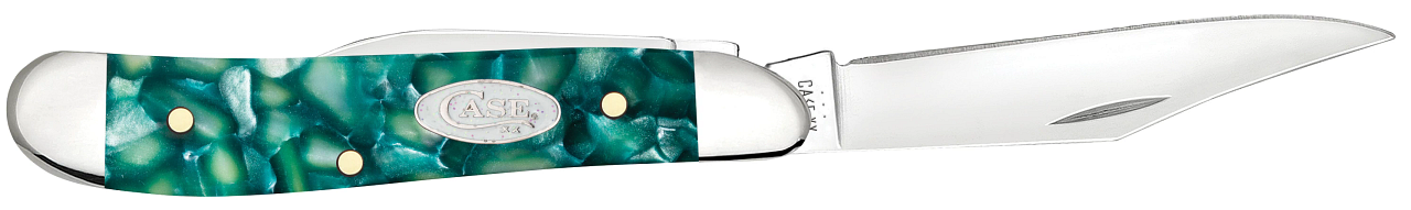 This W.R. Case & Sons Cutlery Co. Peanut knife utilizes a 2 1/8" Clip blade and 1 1/2" Pen blade. Stamped with pattern number 10220 SS, the blade material is Tru-Sharp Stainless Steel with a Mirror-polished finish. The handle is Green Sparxx Kirinite with an Oval White Sparxx Case Inlay shield. The bolsters are highly polished Nickel Silver. It's around 2 3/4 inches long (folded/closed) and weighs approximately 1.2 ounces.