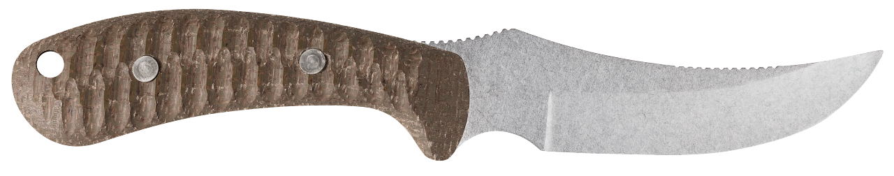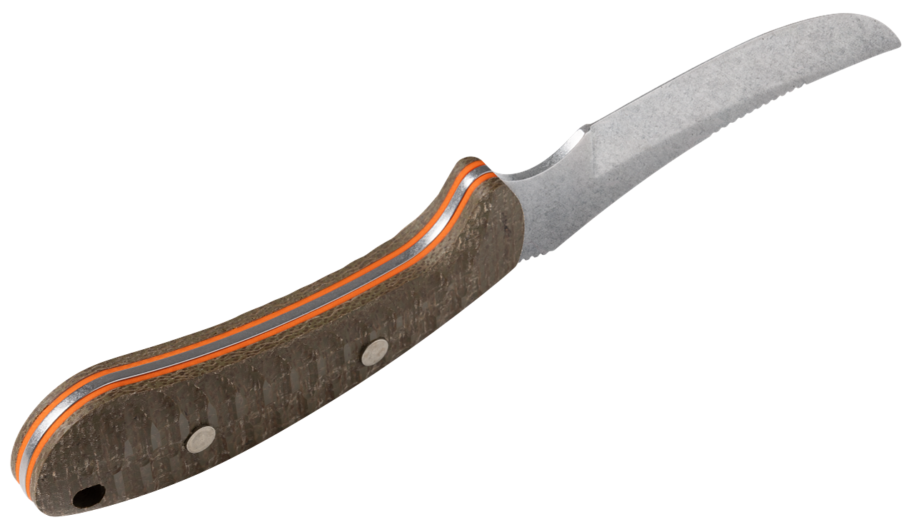 This W.R. Case & Sons Cutlery Co. Ridgeback Fixed Blade Hunter knife utilizes a 4 1/8" Trailing Point Skinner blade with a plain edge, spine jimping, thumb ramp, and finger choil. Stamped with pattern number RIDGEBACK SS, the blade material is Tru-Sharp Surgical Stainless Steel with a Stonewashed finish. The handle is textured OD Green Burlap Laminate with Orange G-10 liners, finger guard and lanyard hole. It's around 8 1/2 inches long (total) and weighs approximately 4.5 ounces. The knife is presented with a Leather Belt Sheath.