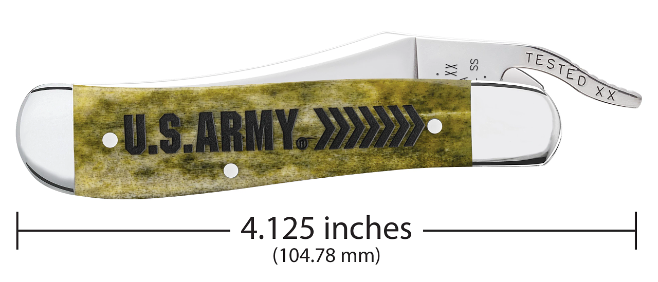 This W.R. Case & Sons Cutlery Co. Russlock knife utilizes a 2 3/4" Locking Clip Point blade with thumb lever. Stamped with pattern number 61953L SS, the blade material is Tru-Sharp Surgical Stainless Steel with a mirror-polished finish. The handle is Olive Green Bone engraved with black U.S. Army logo. The bolsters are Highly polished Nickel Silver. It's around 4 1/8 inches long (folded/closed) and weighs approximately 2.5 ounces.