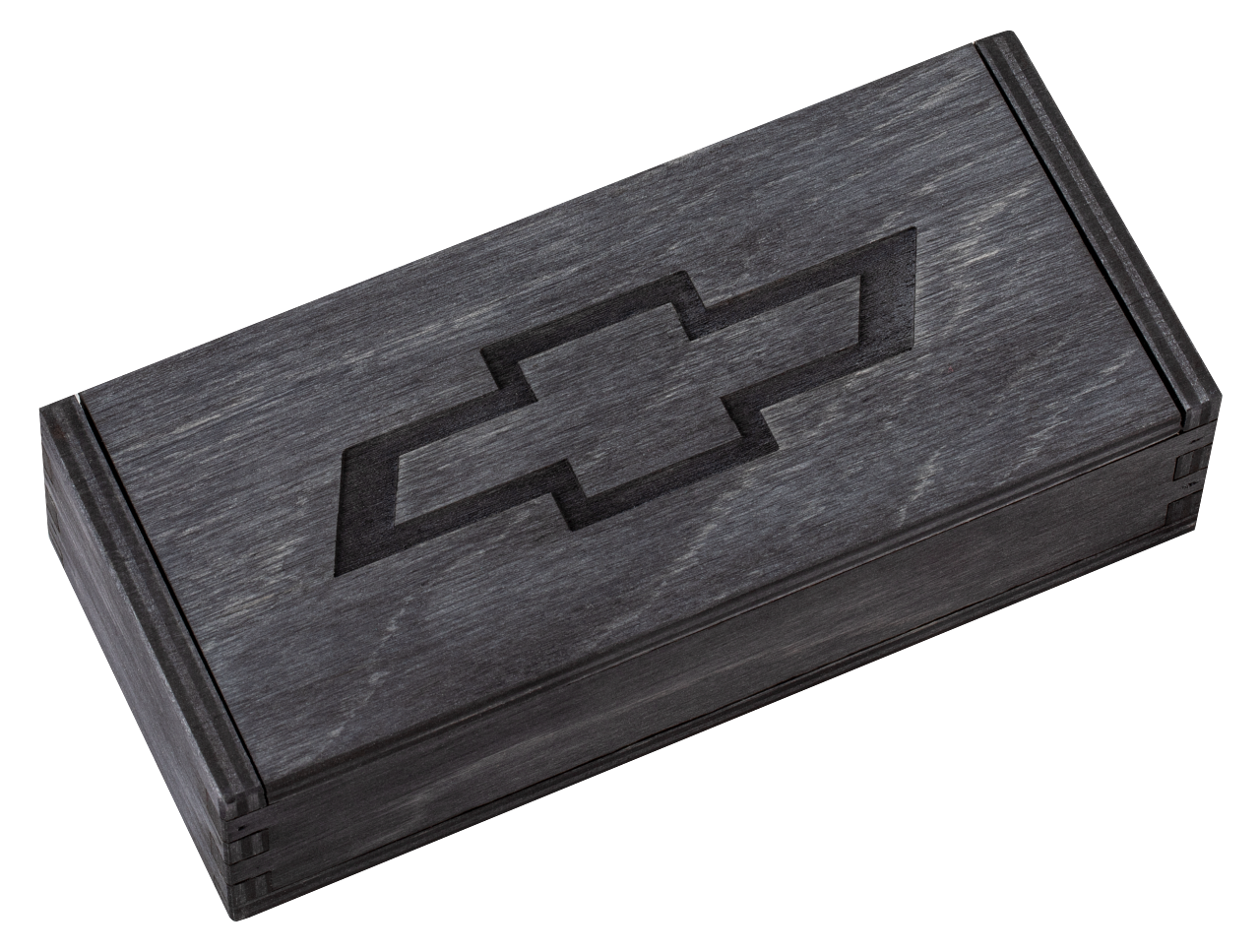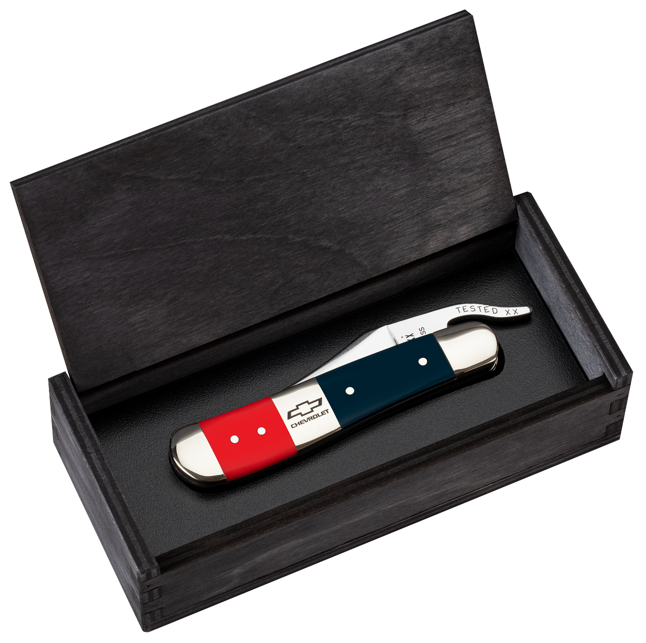 This W.R. Case & Sons Cutlery Co. Russlock knife utilizes a 2 3/4" Locking Clip Point blade with thumb lever. Stamped with pattern number 61953L SS, the blade material is Tru-Sharp Surgical Stainless Steel with a mirror-polished finish and etched with 'CHEVROLET'. The handle is Red & Blue Synthetic with a Nickel Silver Center Bolster engraved with the Chevrolet logo. The bolsters are Highly polished Nickel Silver. It's around 4 1/8 inches long (folded/closed) and weighs approximately 2.5 ounces. The knife is presented with a Wooden Presentation Box with Chevrolet Logo.