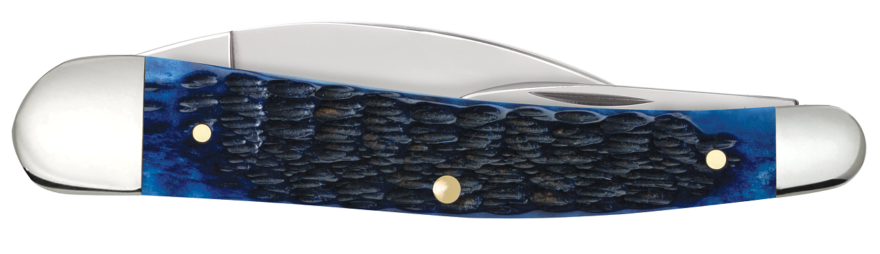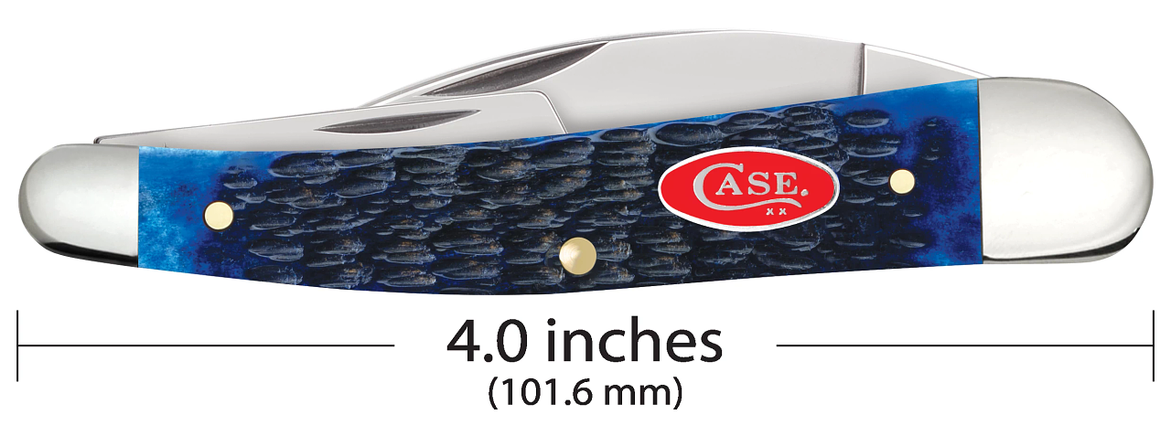 This W.R. Case & Sons Cutlery Co. Seahorse Whittler knife utilizes a 2 1/4" Wharncliffe blade, 1 1/2" Coping blade and 1 1/2" Pen blade. Stamped with pattern number 6355WH SS, the blade material is Tru-Sharp Surgical Stainless Steel with a mirror-polished finish. The handle is Rodgers Jigged Navy Blue Bone with a Red Oval Script Inlay shield. The bolsters are Highly polished Nickel Silver. It's around 4 inches long (folded/closed) and weighs approximately 2.4 ounces.