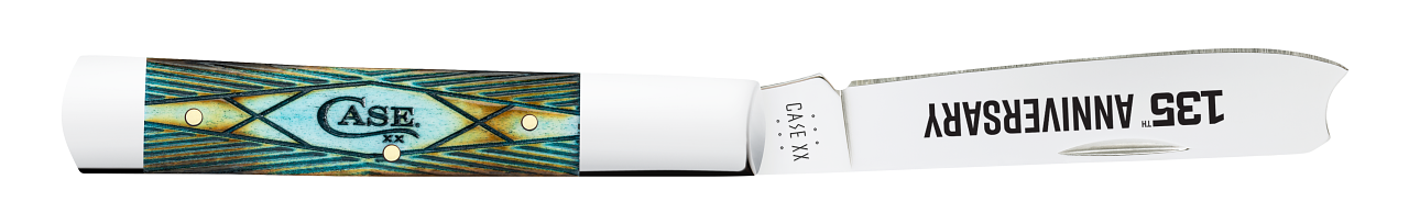 One of only 350 made! This W.R. Case & Sons Cutlery Co. Single-blade Razor Jack knife utilizes a 3" Razor blade. Stamped with pattern number 61005RAZ SS, the blade material is Tru-Sharp Surgical Stainless Steel with a mirror-polished finish. The handle is Teal & Brown Color-washed Natural Bone embellished with Case Logo etching. The bolsters are Highly polished Nickel Silver. It's around 3 7/8 inches long (folded/closed) and weighs approximately 2.4 ounces. The knife is presented with a Case Collectable Medallion and Padded Presentation Box.