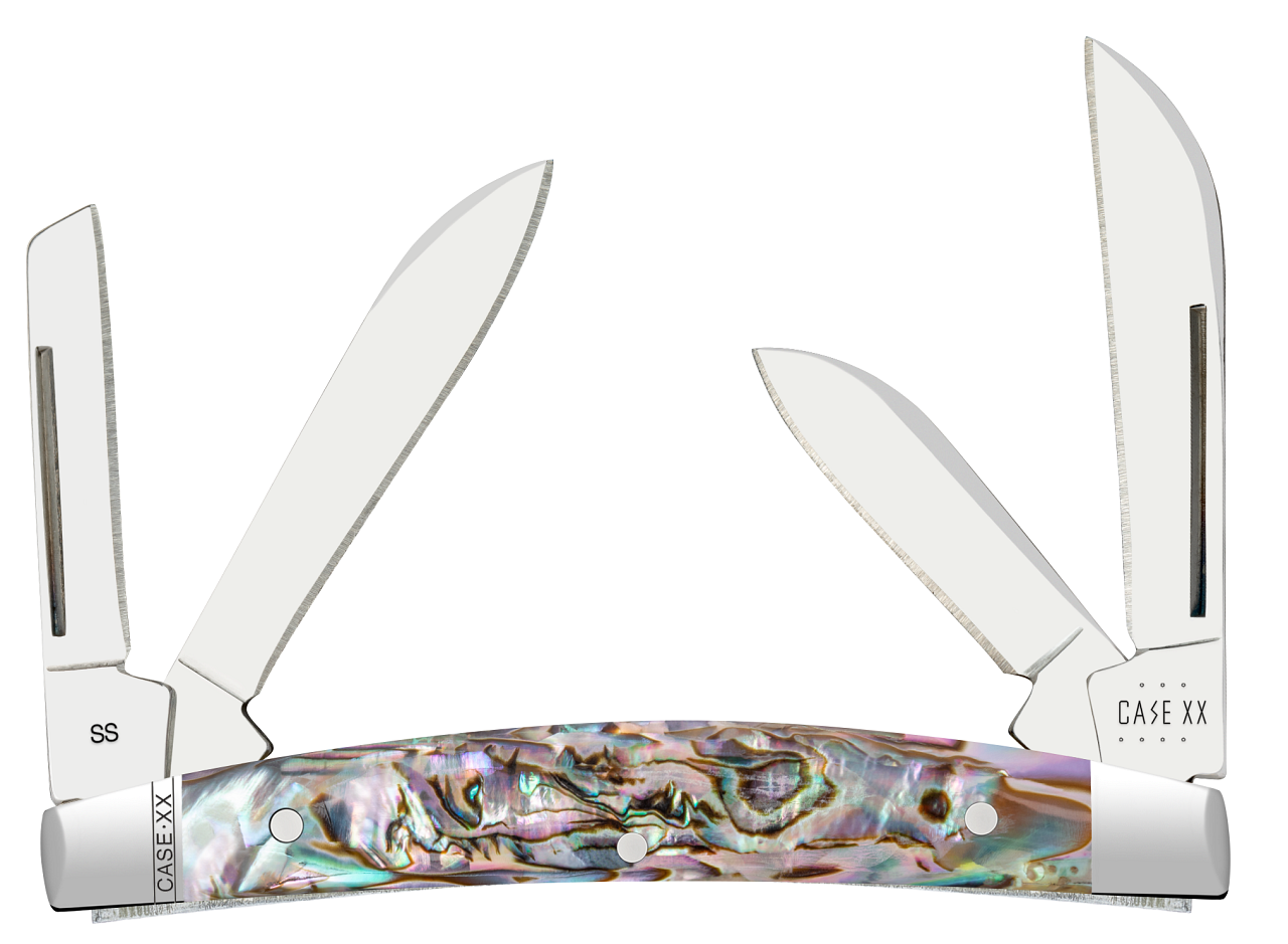 This W.R. Case & Sons Cutlery Co. Small Congress knife utilizes a 2 3/8" Spear blade, 1 3/4" Pen blade, 1 3/4" Coping blade and 2 3/8" Sheepfoot Coping blade. Stamped with pattern number 8468 SS, the blade material is Tru-Sharp Surgical Stainless Steel with Mirror-polished finish. The smooth handle is genuine Abalone. The bolsters are 'Case XX' engraved Nickel Silver. It's around 3 1/8 inches long (folded/closed) and weighs approximately 1.6 ounces. Handcrafted in the U.S.A., this knife comes complete with Limited Lifetime Manufacturer's Warranty, a Black Velvet Box.