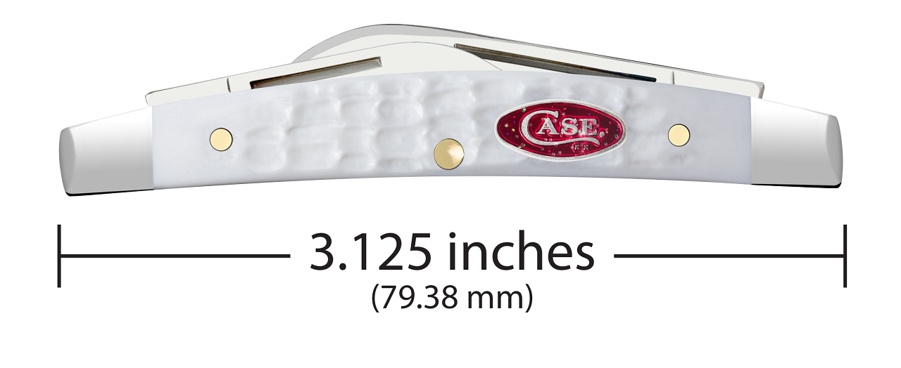 This W.R. Case & Sons Cutlery Co. Small Congress knife utilizes a 3 1/4" Clip blade, 2 1/4" Sheepsfoot Coping blade and 2 1/4" Spey blade. Stamped with pattern number 6268 SS, the blade material is Tru-Sharp Surgical Stainless Steel with Mirror-polished finish. The handle is Standard Jig White Synthetic with an Oval Nickel Silver Red SparXX Inlay shield. The bolsters are highly polished Nickel Silver. It's around 3 1/8 inches long (folded/closed) and weighs approximately 1.2 ounces.