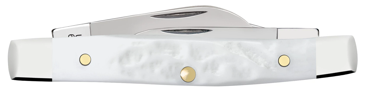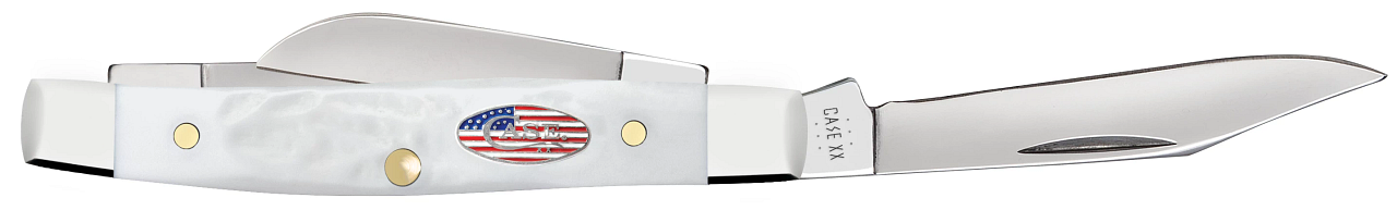 This W.R. Case & Sons Cutlery Co. Small Stockman knife utilizes a 2" Clip blade, 1 1/2" Sheepsfoot Coping blade and 1 1/2" Pen blade. Stamped with pattern number 6333 SS, the blade material is Tru-Sharp Surgical Stainless Steel with a mirror-polished finish. The handle is Rough jigged White Synthetic with a Nickel Silver Oval Stars & Stripes Inlay shield. The bolsters are Highly polished Nickel Silver. It's around 2 5/8 inches long (folded/closed) and weighs approximately 1.1 ounces.