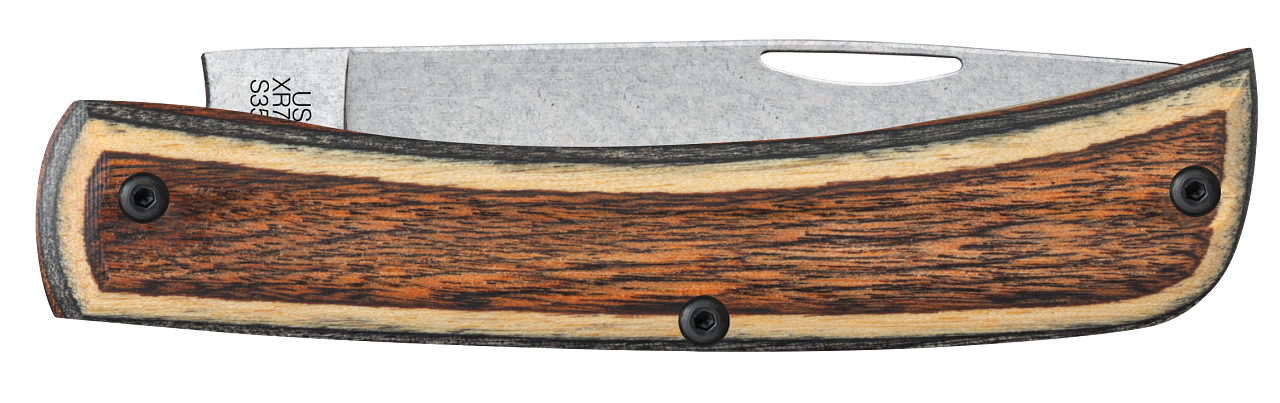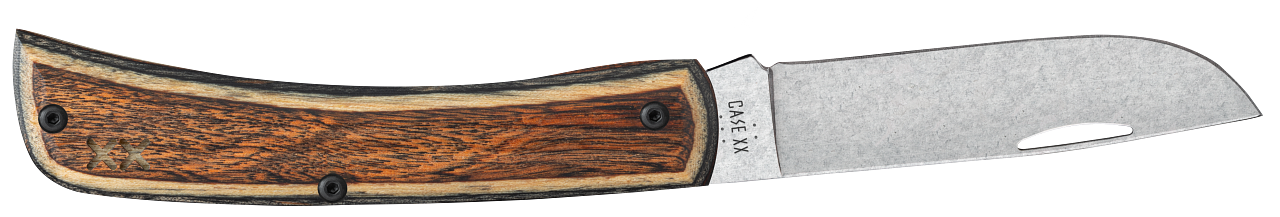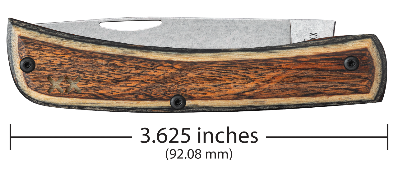 This W.R. Case & Sons Cutlery Co. Sod Buster Jr knife utilizes a 2 7/8" Skinner blade. Stamped with pattern number XR7137 S35VN, the blade material is CPM S35VN Stainless Steel with a Stonewashed finish. The handle is smooth Brown & Black Laminate Dymalux Wood engraved with XX logo. It's around 3 3/4 inches long (folded/closed) and weighs approximately 2.0 ounces.