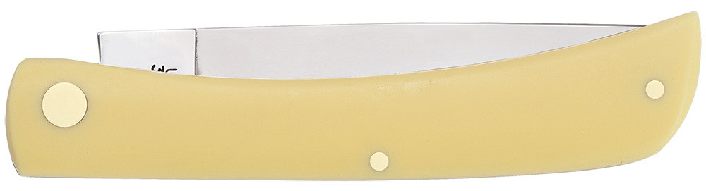 This W.R. Case & Sons Cutlery Co. Sodbuster knife utilizes a 3 3/4" Skinner blade. Stamped with pattern number 3138 CS, the blade material is Carbon Steel.Note: Carbon Steel is generally harder than stainless steel, this allows the blade to hold a sharper edge, longer. However, Carbon Steel will corrode/rust if it's not cleaned and oiled regularly. The handle material is high-visibility Yellow Delrin. It's around 4 5/8 inches long (folded/closed) and weighs approximately 3.4 ounces.