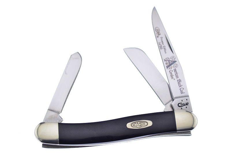 One of only 1200 made! This W.R. Case & Sons Cutlery Co. Stockman knife utilizes a 2 1/2" Clip blade, 1 7/8" Sheepfoot Coping blade and 1 3/4" Spey blade. Stamped with pattern number 9318 SS, the blades are highly polished Tru-Sharp Surgical Stainless Steel with "Premier Edition 1 of 1200" and "America's Black Coal Corelon" etching. The handle is Custom Genuine America's Black Coal Corelon with an Oval Nickel Silver Case Inlay shield. The bolsters are highly polished Nickel Silver. It's around 3 5/8 inches long (folded/closed) and weighs approximately 2.3 ounces.