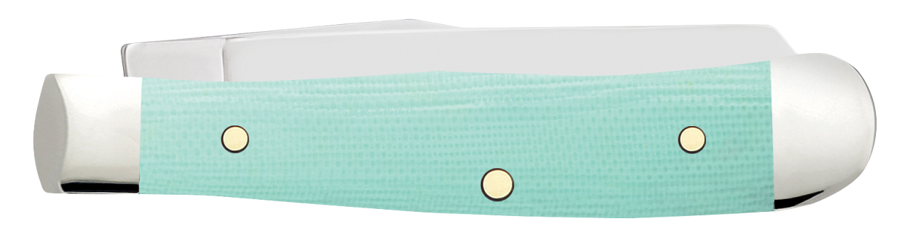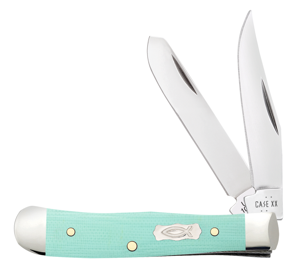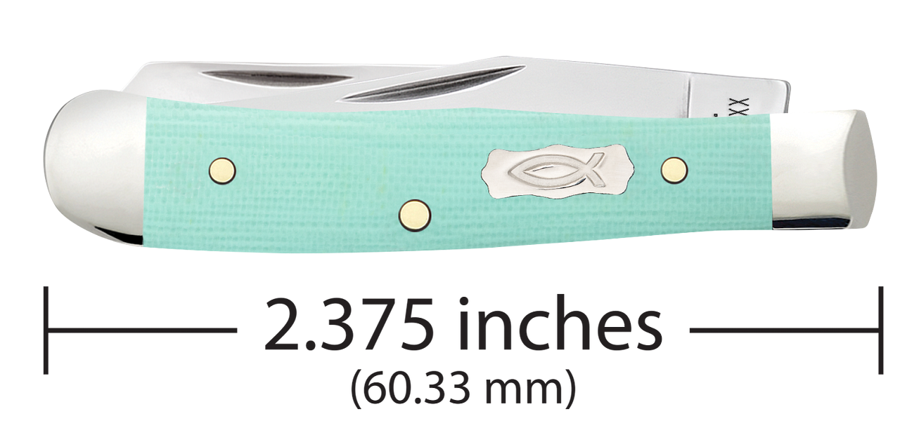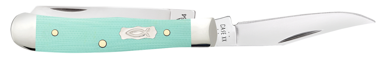 This W.R. Case & Sons Cutlery Co. Tiny Trapper knife utilizes a 1 7/8" Clip blade and 1 7/8" Spey blade. Stamped with pattern number 102154 SS, the blade material is Tru-Sharp Surgical Stainless Steel with a mirror-polished finish. The handle is Seafoam Green G-10 with a Nickel Silver Ichthus Inlay shield. The bolsters are Highly polished Nickel Silver. It's around 2 3/8 inches long (folded/closed) and weighs approximately 1.0 ounces.