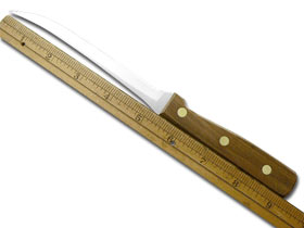 This W.R. Case & Sons Cutlery Co. Tomato/Utility Knife knife utilizes a 5 1/4" Utility blade. The blade is Miracl-edge Stainless Steel with Case XX 628 Stainless and Made in U.S.A. etching. The handle is Walnut Wood with Case XX etching. It's around 9 1/2 inches long (total) and weighs approximately 1.9 ounces.