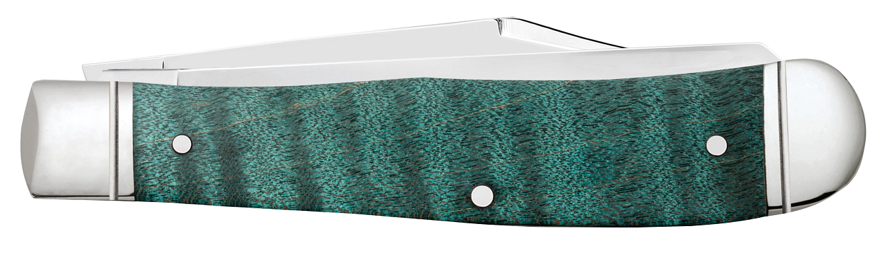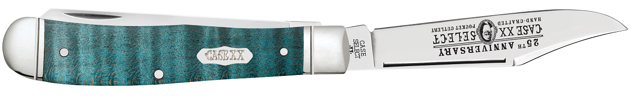One of only 400 made! This W.R. Case & Sons Cutlery Co. Trapper knife utilizes a 3 1/4" Clip blade and 3 1/4" Spey blade. Stamped with pattern number 7254 SS, the blade material is Tru-Sharp Surgical Stainless Steel with a mirror-polished finish and etched with '25th Anniversary Case XX Select Handcrafted Pocket Cutlery'. The handle is smooth Turquoise Curly Maple Wood with a Nickel Silver Case Select Inlay shield. The bolsters are Fluted Nickel Silver. It's around 4 1/8 inches long (folded/closed) and weighs approximately 3.8 ounces. The knife is presented with a Case Select Velvet Box.