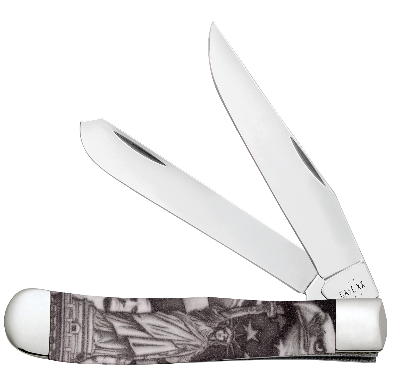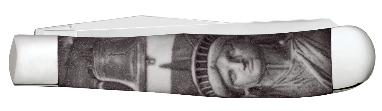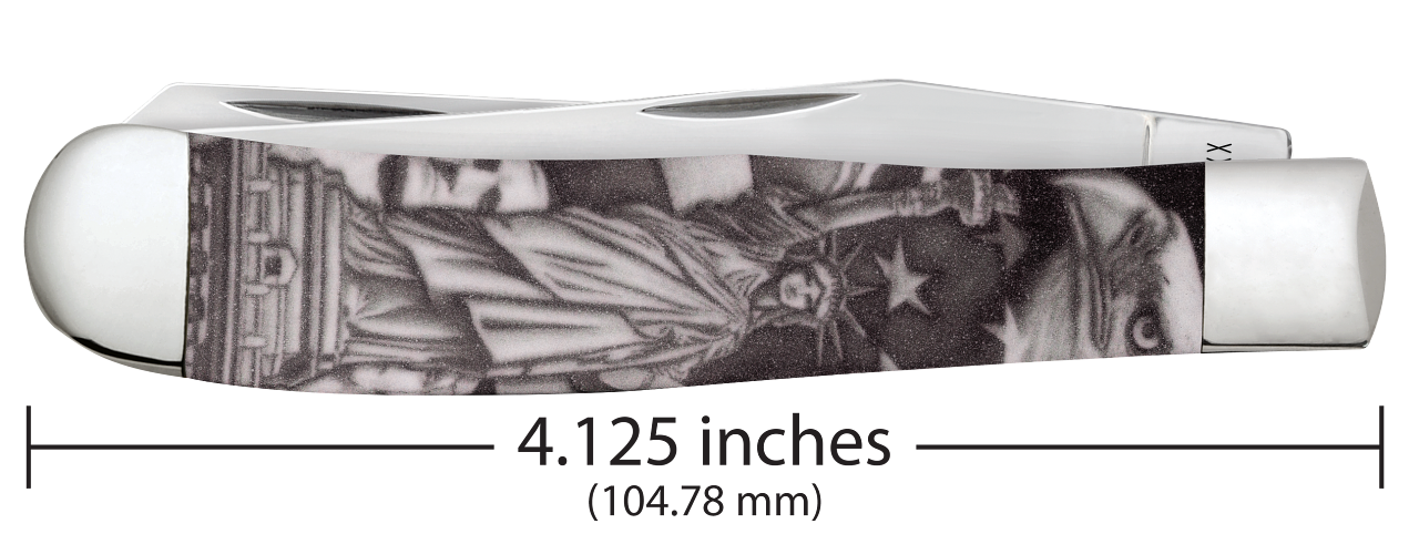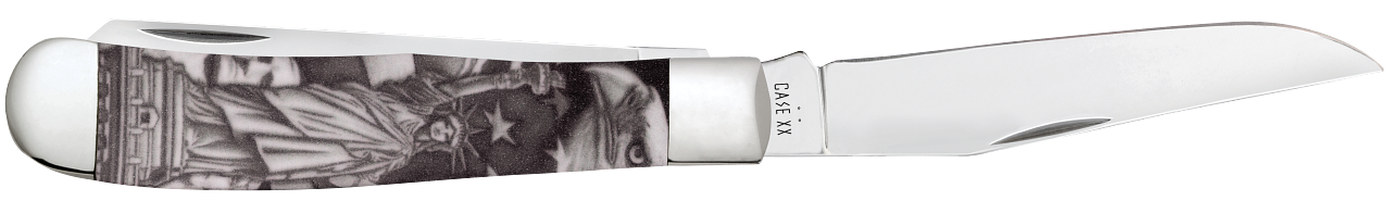 This W.R. Case & Sons Cutlery Co. Trapper knife utilizes a 3 1/4" Clip blade and 3 1/4" Spey blade. Stamped with pattern number 4254 SS, the blade material is Tru-Sharp Surgical Stainless Steel with a mirror-polished finish. The handle is smooth White Synthetic with color-infusion Statue of Liberty, Bald Eagle, and Liberty Bell graphic on both sides. The bolsters are Highly polished Nickel Silver. It's around 4 1/8 inches long (folded/closed) and weighs approximately 3.8 ounces.