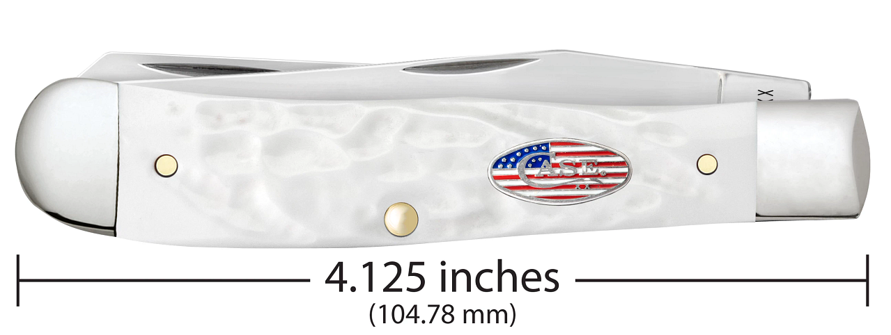 This W.R. Case & Sons Cutlery Co. Trapper knife utilizes a 3 1/4" Clip blade and 3 1/4" Spey blade. Stamped with pattern number 6254 SS, the blade material is Tru-Sharp Surgical Stainless Steel with a mirror-polished finish. The handle is Rough jigged White Synthetic with a Nickel Silver Oval Stars & Stripes Inlay shield. The bolsters are Highly polished Nickel Silver. It's around 4 1/8 inches long (folded/closed) and weighs approximately 3.8 ounces.