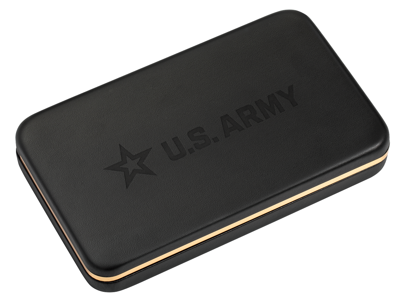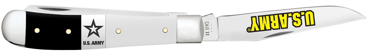 This W.R. Case & Sons Cutlery Co. Trapper knife utilizes a 3 1/4" Clip blade and 3 1/4" Spey blade. Stamped with pattern number 4254 SS, the blade material is Tru-Sharp Surgical Stainless Steel with a mirror-polished finish and etched with 'U.S. Army'. The handle is White & Black Synthetic with a Nickel Silver Center Bolster engraved with the U.S. Army insignia. The bolsters are Highly polished Nickel Silver. It's around 4 1/8 inches long (folded/closed) and weighs approximately 3.8 ounces. The knife is presented with a Case Collectable Medallion and Black 'U.S. Army' Presentation Box.