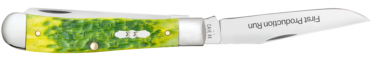 One of only 250 made! This W.R. Case & Sons Cutlery Co. Trapper knife utilizes a 3 1/4" Clip blade and 3 1/4" Spey blade. Stamped with pattern number 6254 SS, the blade material is Tru-Sharp Surgical Stainless Steel with a mirror-polished finish and etched with 'First Production Run'. The handle is Peach Seed Jigged Green Apple Bone with a Nickel Silver XX Propeller Inlay shield. The bolsters are Highly polished Nickel Silver. It's around 4 1/8 inches long (folded/closed) and weighs approximately 3.8 ounces.
