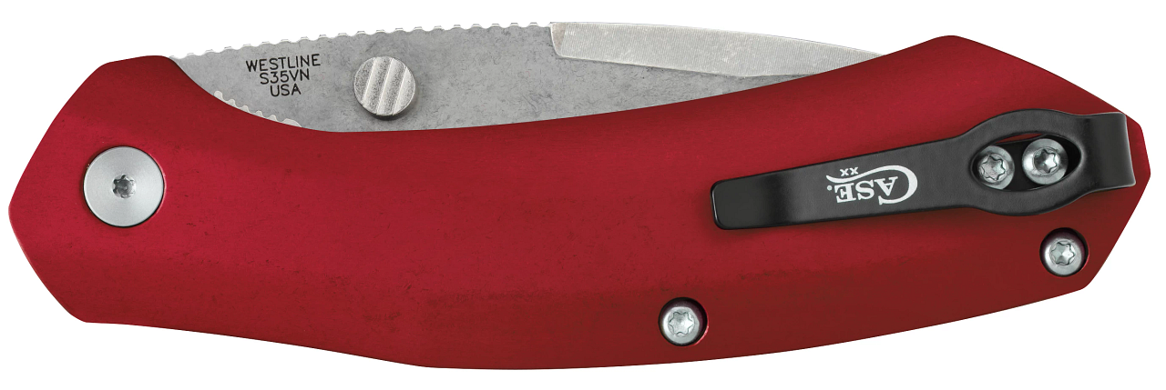 This W.R. Case & Sons Cutlery Co. Westline Liner Lock knife utilizes a 3 1/2" Locking Drop Point blade with a plain edge, 2.5mm thickness, spine jimping and thumb studs that are aided by a reflex spring. Stamped with pattern number WESTLINE S35VN, the blade material is CPM S35VN Stainless Steel with a Stonewashed finish. The handle is Red anodized Aluminum with a reversible tip-up pocket clip/lanyard hole. It's around 4 5/8 inches long (folded/closed) and weighs approximately 4.5 ounces.